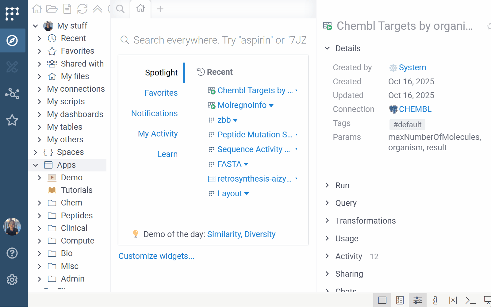 Global search (accessible from Home Page): Find anything across the platform and connected sources: internal, external (e.g., ChEMBL), or general knowledge (e.g., Wikipedia). Search by keywords or tags, registered identifiers, or ask natural language questions like "how do I...?" or "bioactivity for Shigella"