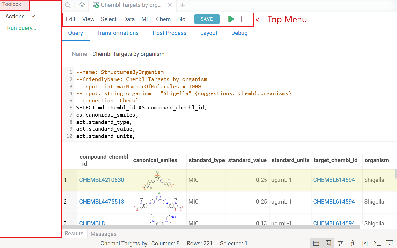 A Query Editor has Top Menu for working with query output and Toolbox with available actions.