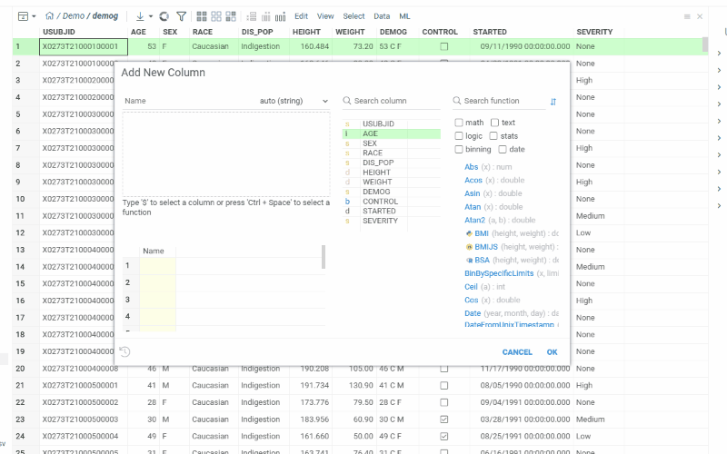 When you use such a function in the “Add New Column” dialog, Datagrok automatically adds all resulting columns to your table and keeps them synchronized.