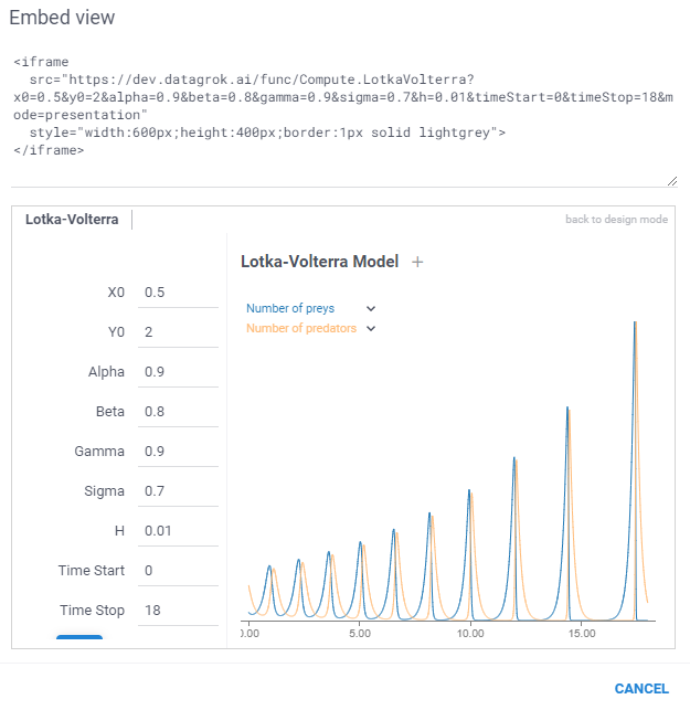 You will see a dialog with the HTML code on top that you can use to embed this into an external site. Note that you can change parameter values right in the URL.