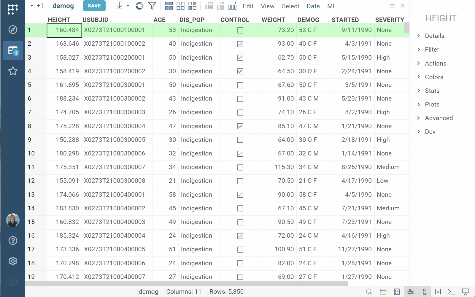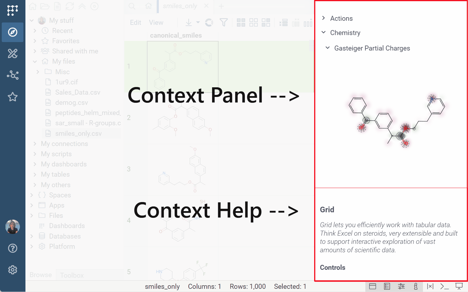 You move between raw data, transformations, visualizations, computations, statistics, model results, and heterogeneous data. Datagrok provides a workspace that allows all those steps to coexist and connect naturally.