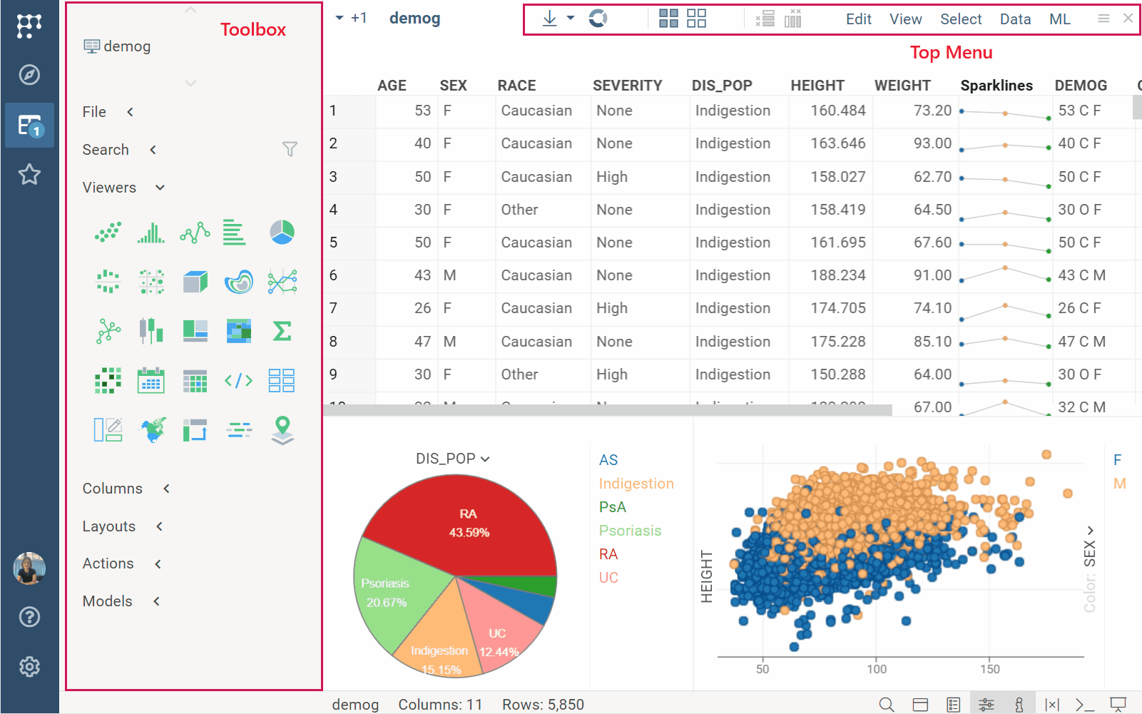 A Table View, used for exploratory data analysis, has a Top Menu with data-related commands and a Toolbox that provides quick access to viewers, view layouts, models, and more.