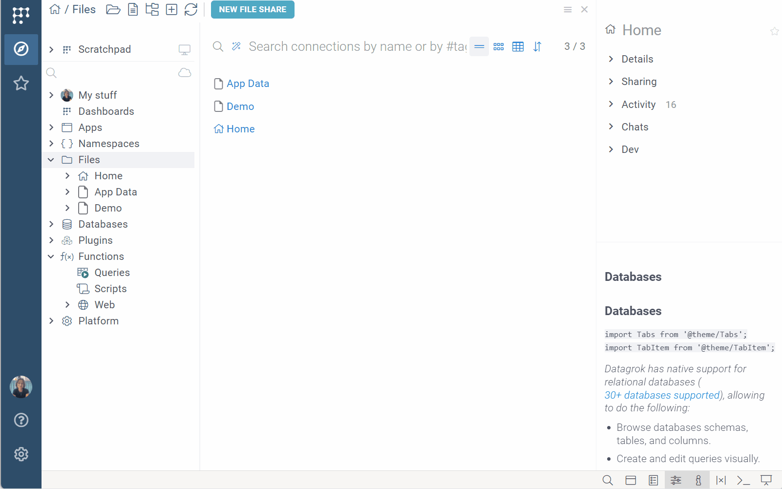 | Files is a file browser for your connected file storage. The tree is organized into several views: My files, Spaces (files belonging to individual projects), App Data (files bundled with installed apps, e.g., clinical studies for Clinical Case), and Demo (sample files for exploring platform capabilities on Datagrok's public instance). |