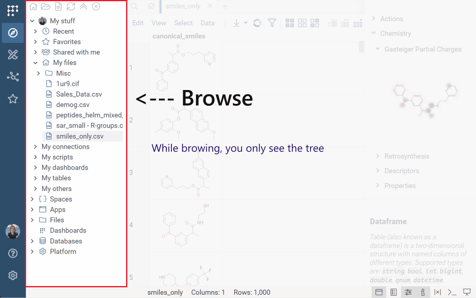The Browse view (opened from the Sidebar) is the main entry point to everything on the platform. For how the Browse view itself looks and behaves, see Browse. This section focuses on what you see in the tree.