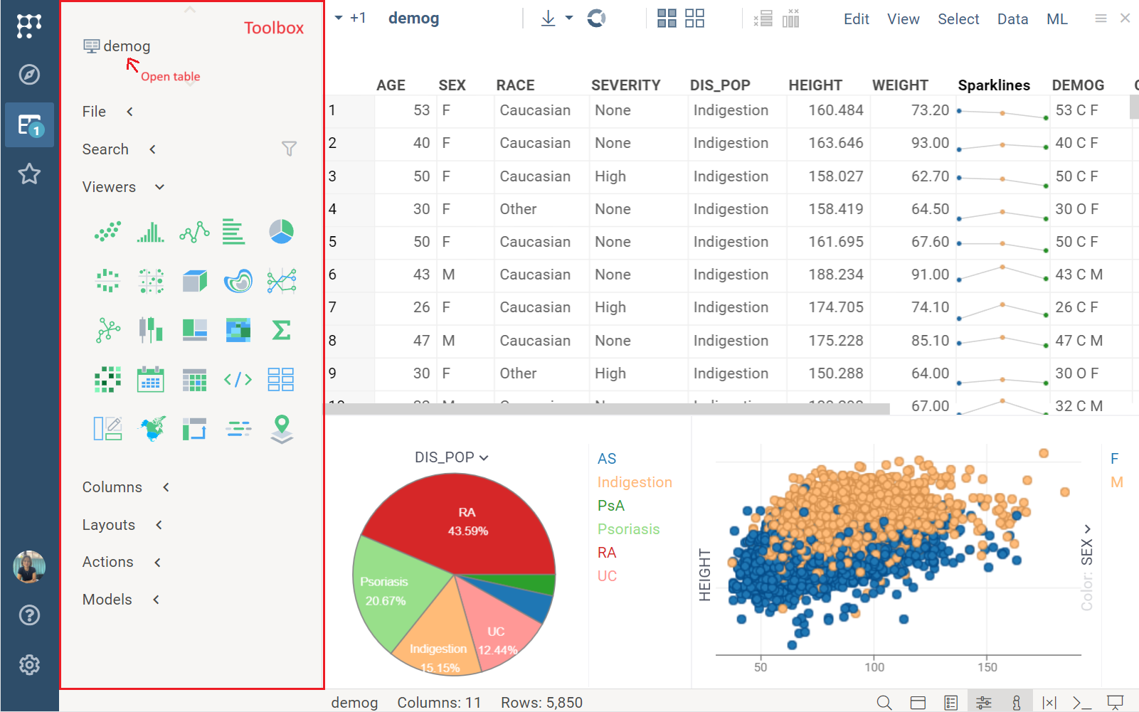 In the Table View, the Toolbox lets you add viewers, refresh dynamic dashboards, filter, search, and do more. The upper part of the Toolbox acts as a navigation tool, displaying a list of all open tables. From here, you can easily switch between different tables by simply clicking on the desired table.