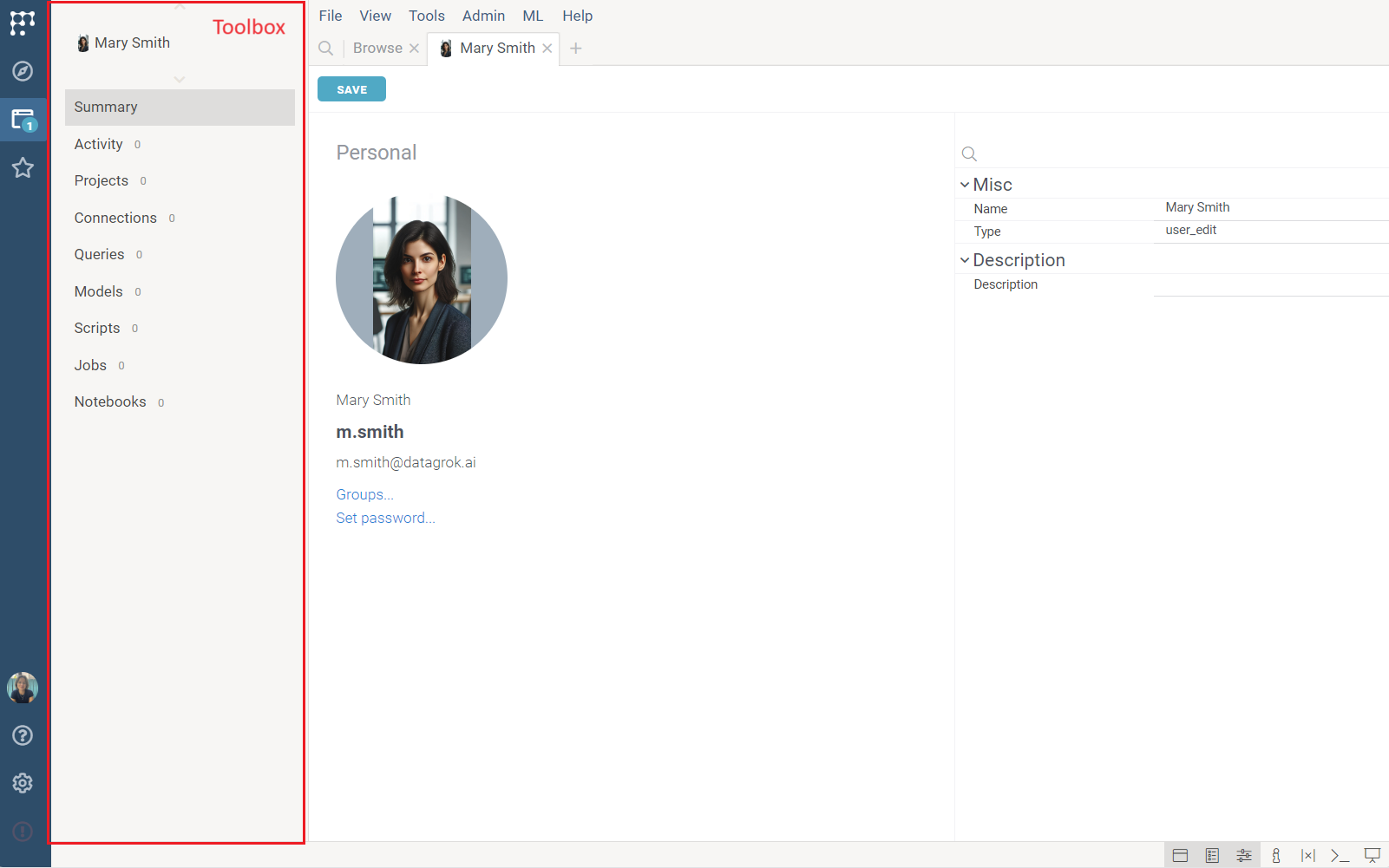In the User Profile View, the Toolbox lets you switch between different views related to the user's profile.