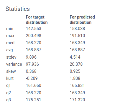 | Distribution | Distribution of the predicted values, and distribution of values in $y$. | Regression problems ($y$ is numerical) | ![]() | |