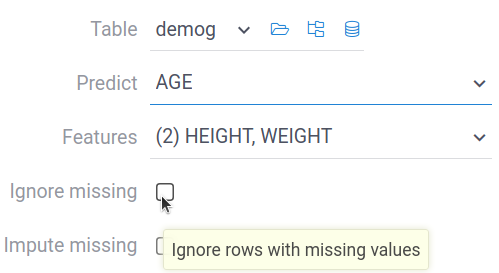 Model setup begins with data configuration. First, we select a table to work with, then we have to choose a target column and feature columns.