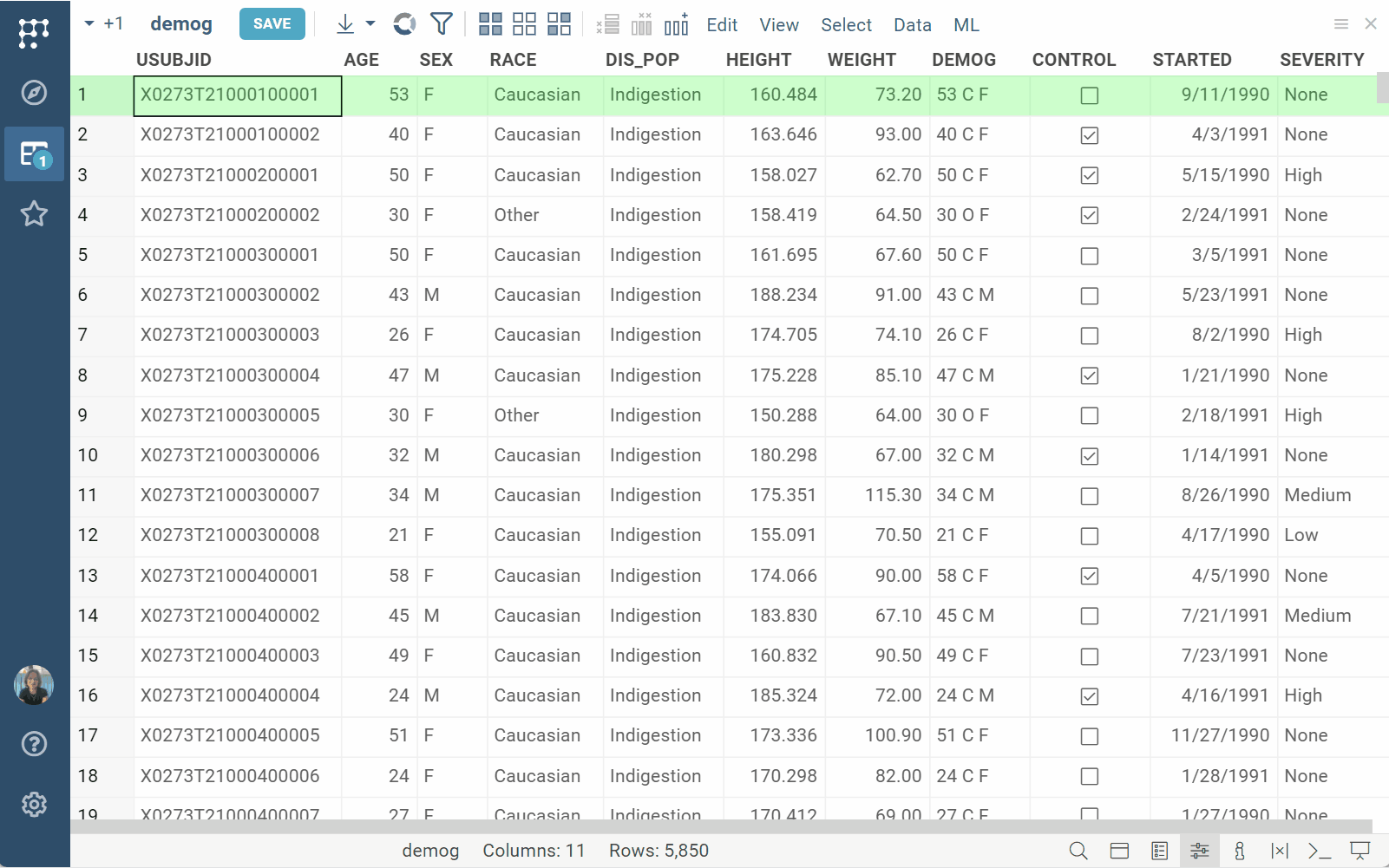 Column Manager (on the Status Bar, click "Columns"), contains a list of columns in the current table. Use it to navigate between columns, select them, or perform batch actions. It also allows to view metadata on multiple columns in a tabular format, as well as other column properties, such as statistics.