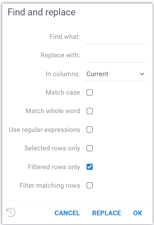 this weekin a datetime column and replace it with a specific date likeNov 7, 2000or7/11/2000. - In string columns, you can also match case, entire word, or use regular expressions for more complex searches.