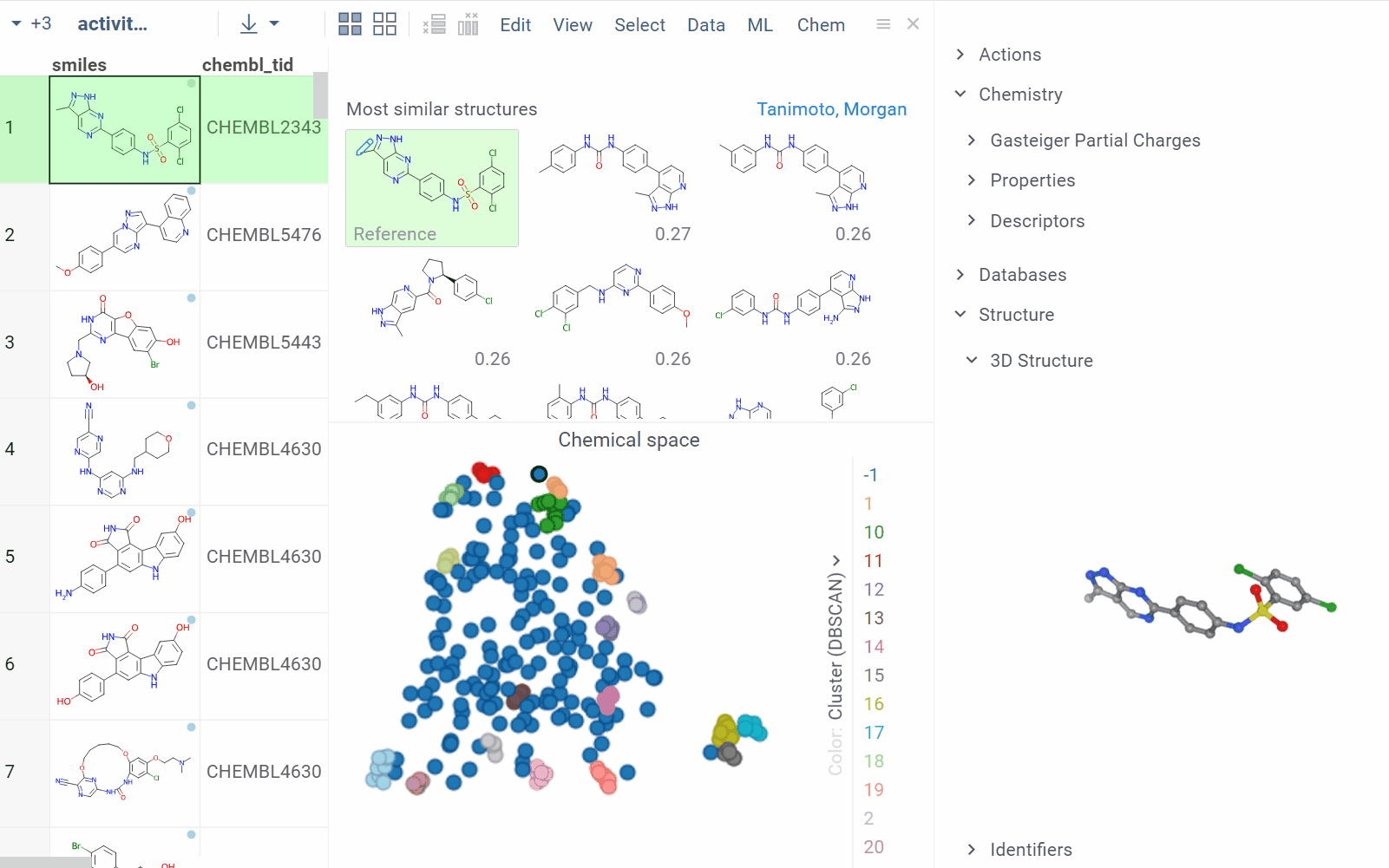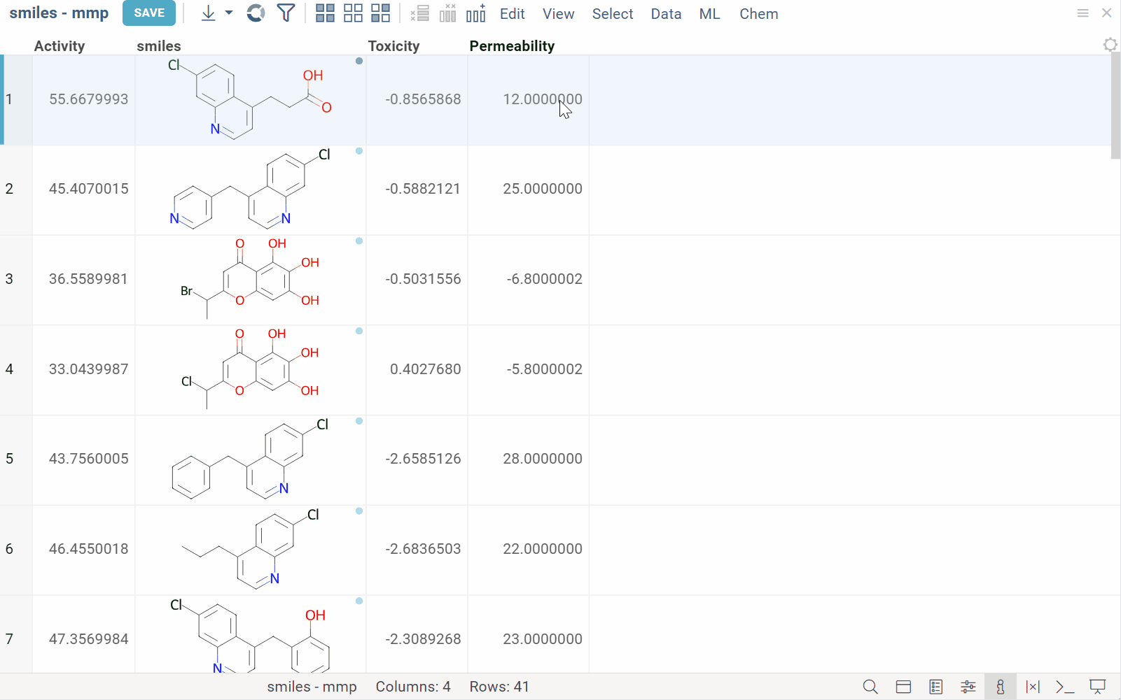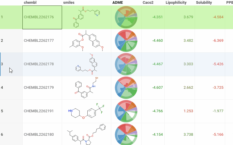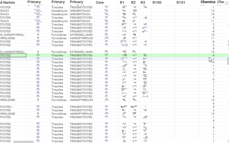 These states are synchronized with other viewers, making it easy to explore your data. For example, moving between rows in the grid updates both the current molecule on a scatterplot and similar molecules in the similarity viewer. The same works in reverse. Clicking a molecule on a scatterplot or a similarity viewer updates the current row in all other viewers, including grid.
