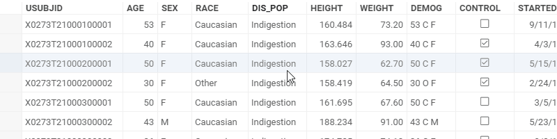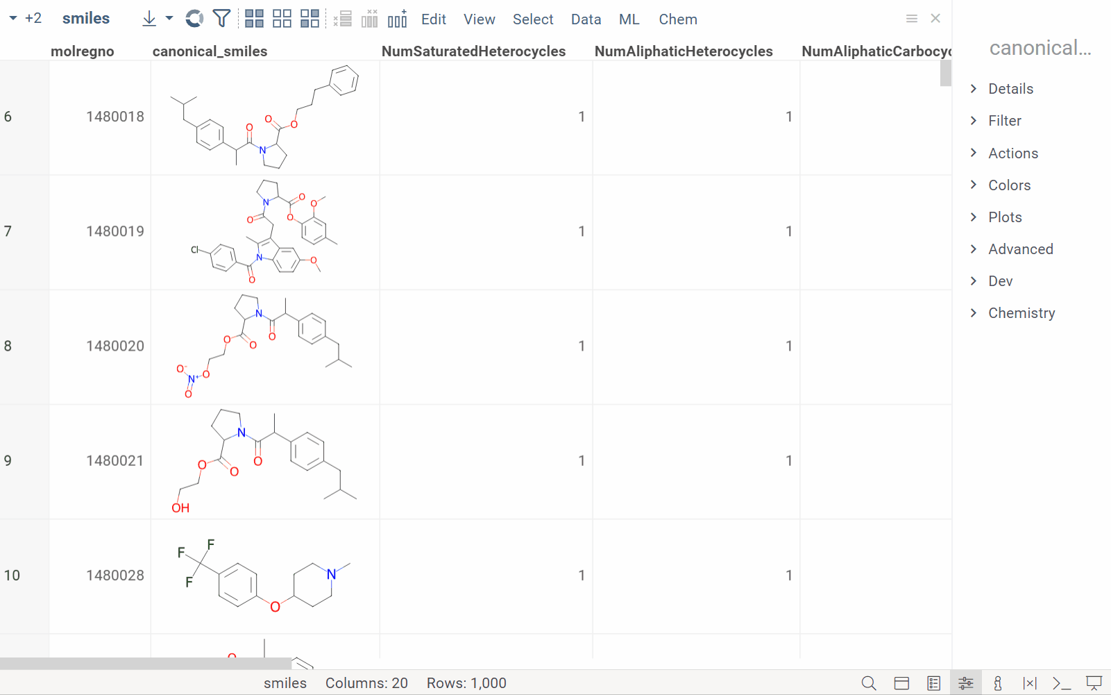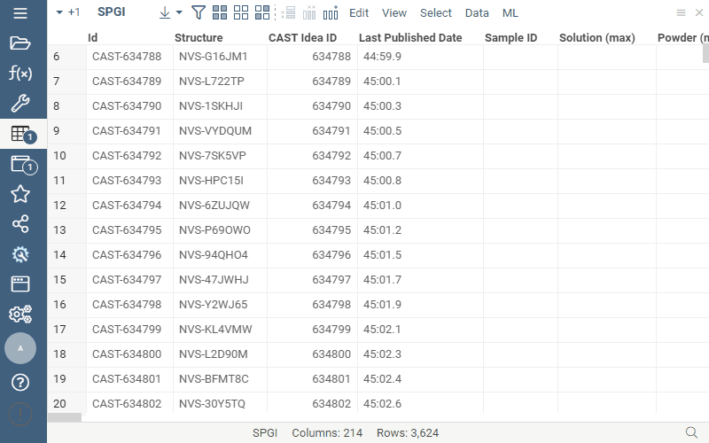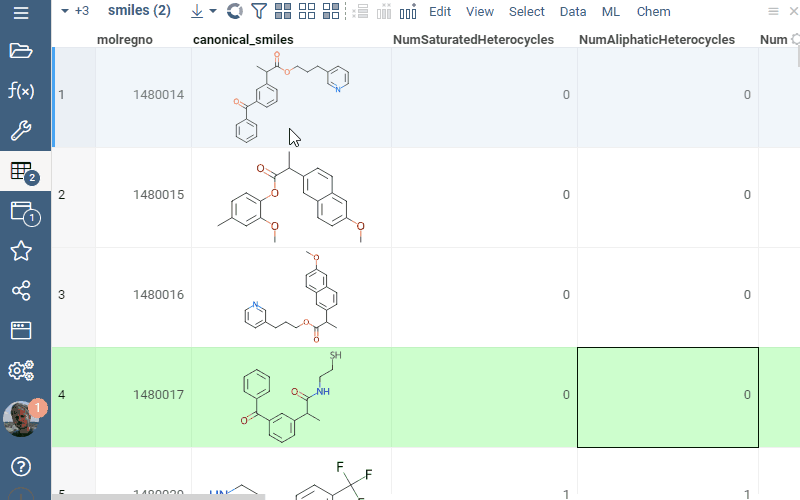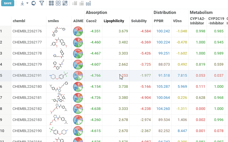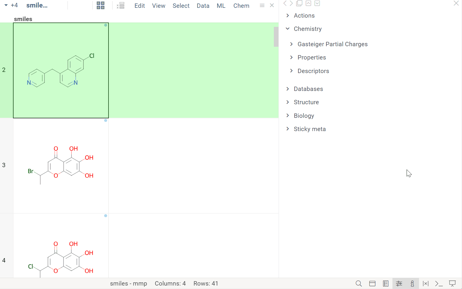 These states are synchronized with other viewers, making it easy to explore your data. For example, moving between rows in the grid updates both the current molecule on a scatterplot and similar molecules in the similarity viewer. The same works in reverse. Clicking a molecule on a scatterplot or a similarity viewer updates the current row in all other viewers, including grid.