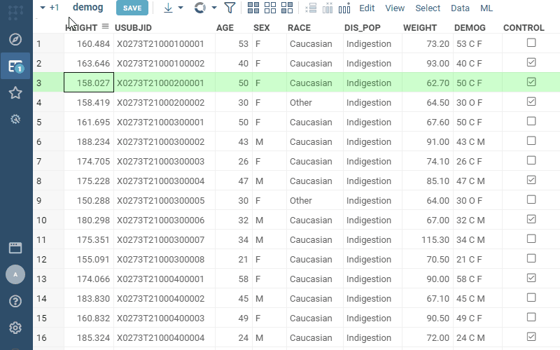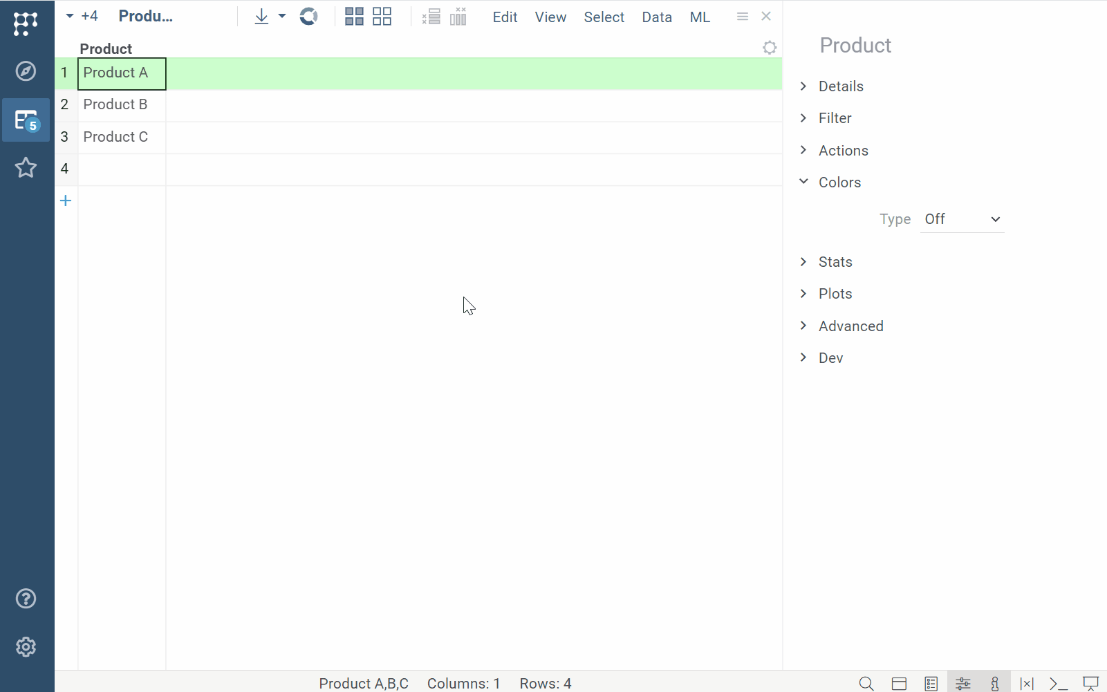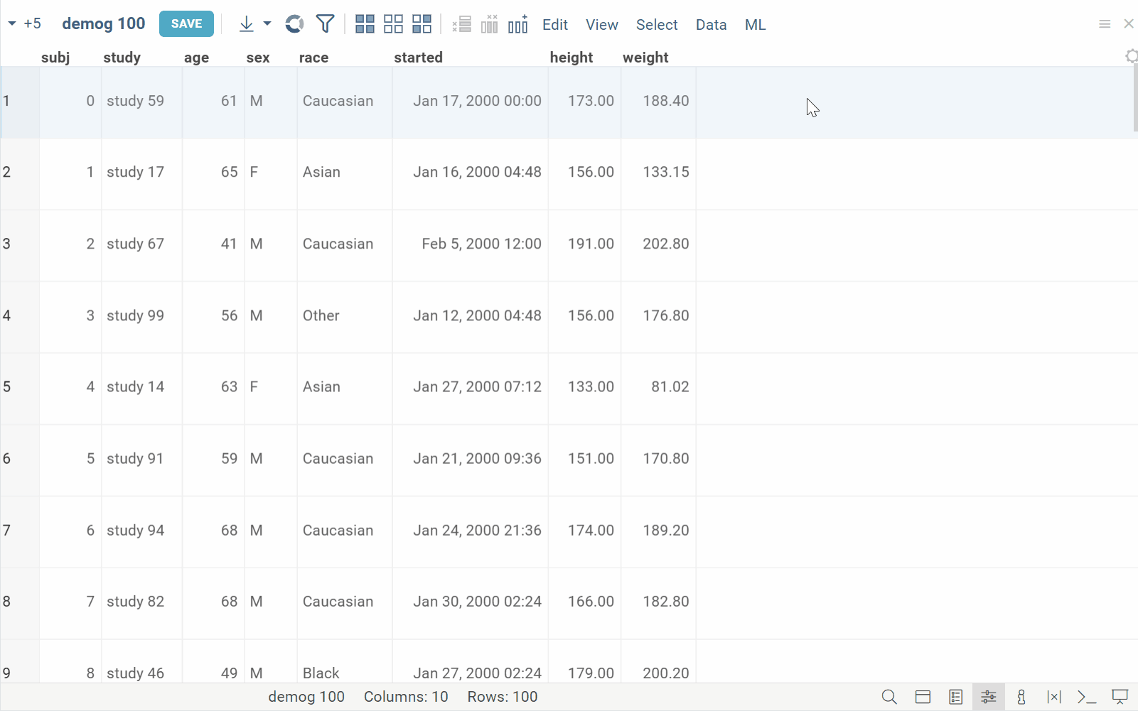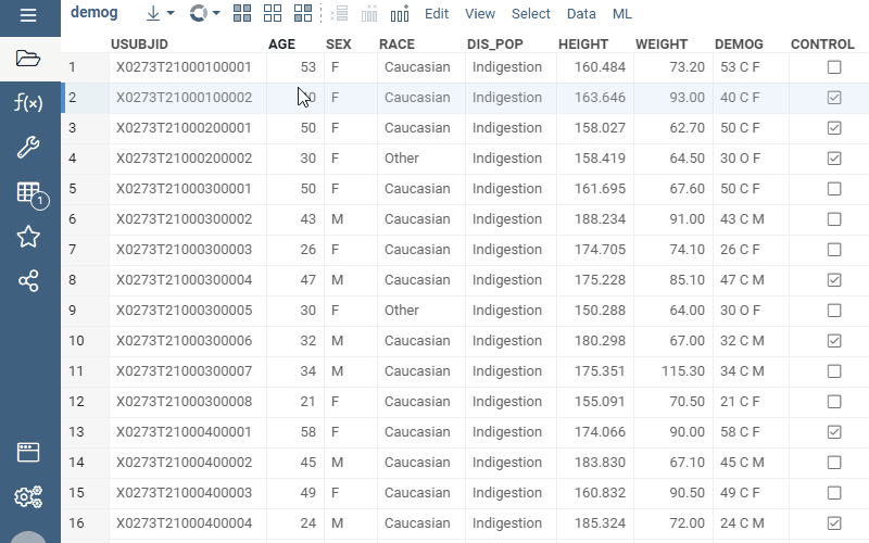 Subject to permissions, you can add, delete, or modify records in your dataset. In addition, the Top Menu provides multiple options for data cleaning and transformation. For example, you can add calculated columns, impute missing values, delete duplicates, and more.
