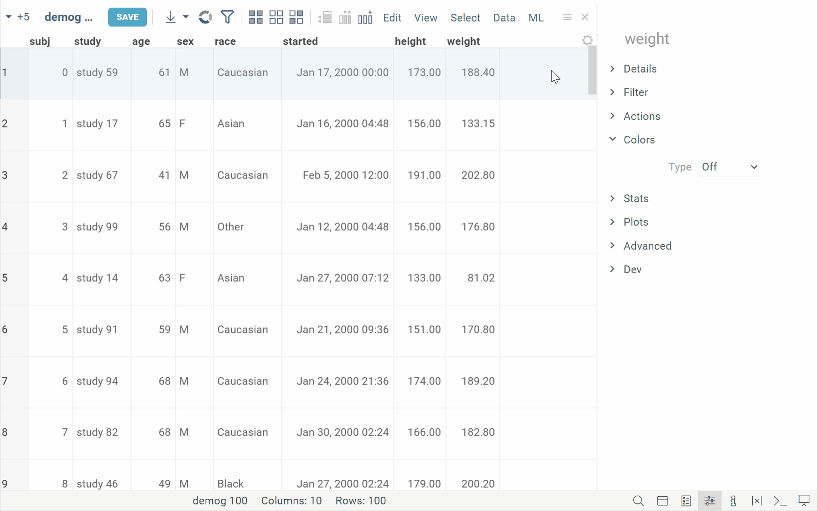 To copy color coding from one column to others, use the Pick Up Coloring and Apply Coloring commands from the column's Color Coding menu. These commands copy both standard and custom color-coding, including the Off setting which removes color coding. Note that you can't transfer settings between numeric and categorical columns. The Apply Coloring command remains inactive if no color coding has been picked up. These settings are retained for a viewer instance but are not saved through layout serialization.