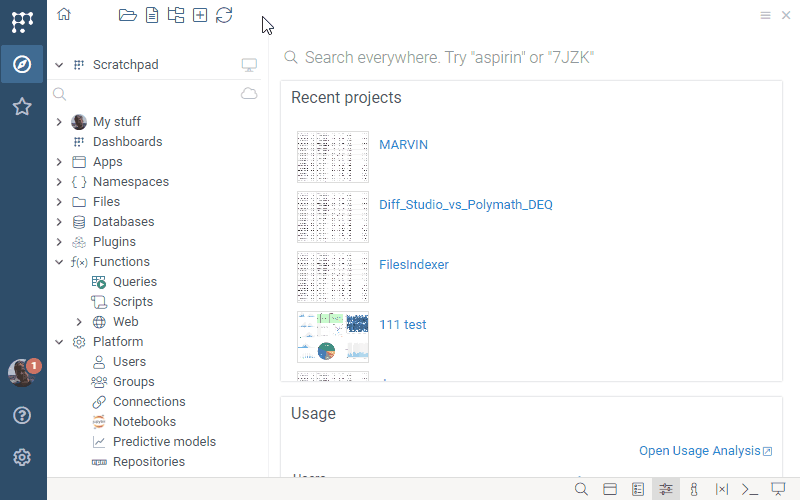 To further aid with data exploration, the Context Panel dynamically updates to show info panes specific to the current object, e.g., a molecule.