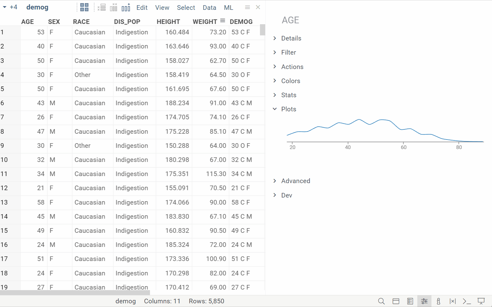 For quick profiling, use the Plots info pane. Simply select columns, and their content is automatically visualized in the Context Panel.