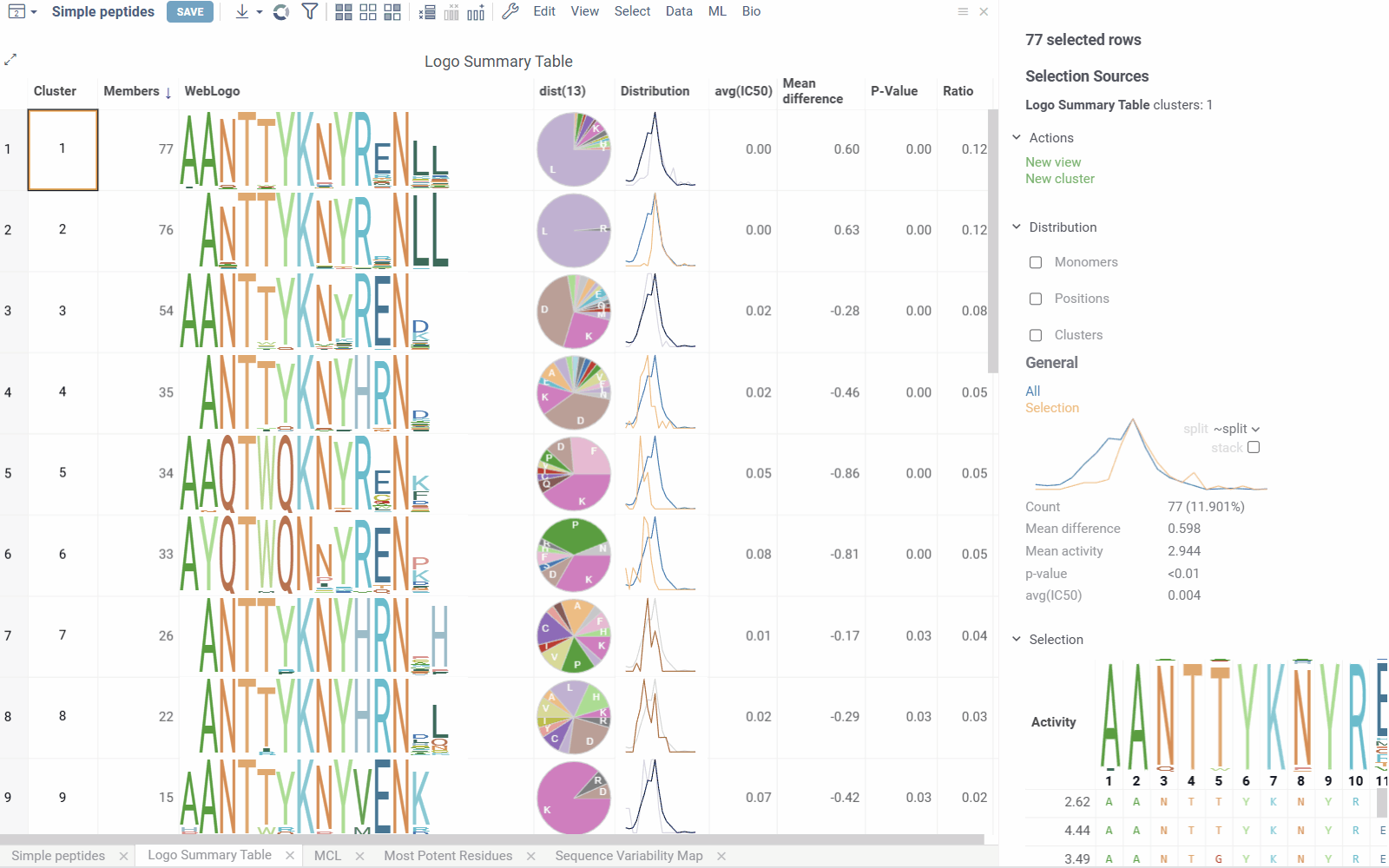 The Logo Summary Table shows WebLogo, activity distribution and statistics for each sequence cluster in your data. Statistics include mean difference, p-value, count and ratio. You can add other column aggregations to the table from its property panel. Numeric columns will use your chosen numeric aggregation (average by default) and categorical columns will add a pie chart showing the distribution within a cluster.