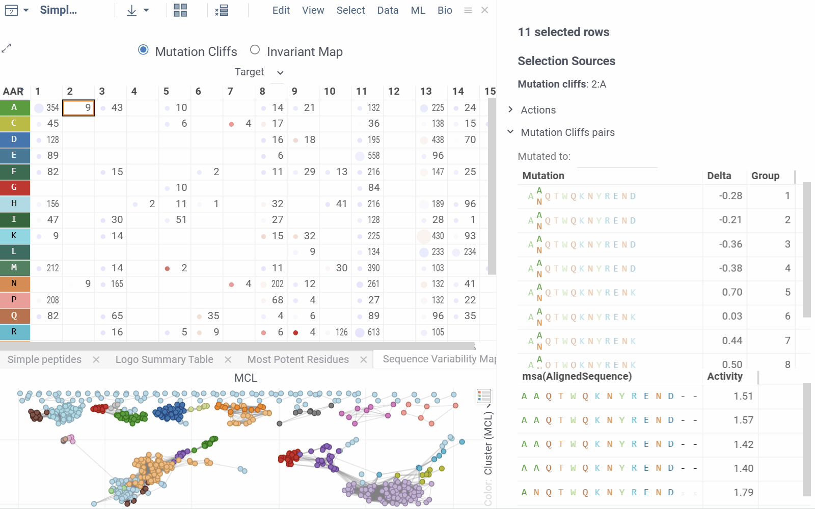 You can further inspect the mutation cliffs from the context panel, which displays mutations and their corresponding sequences.
